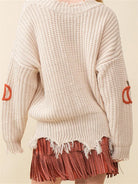 Design: Cream knit with distressed edges and embroidered pumpkin details.