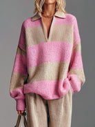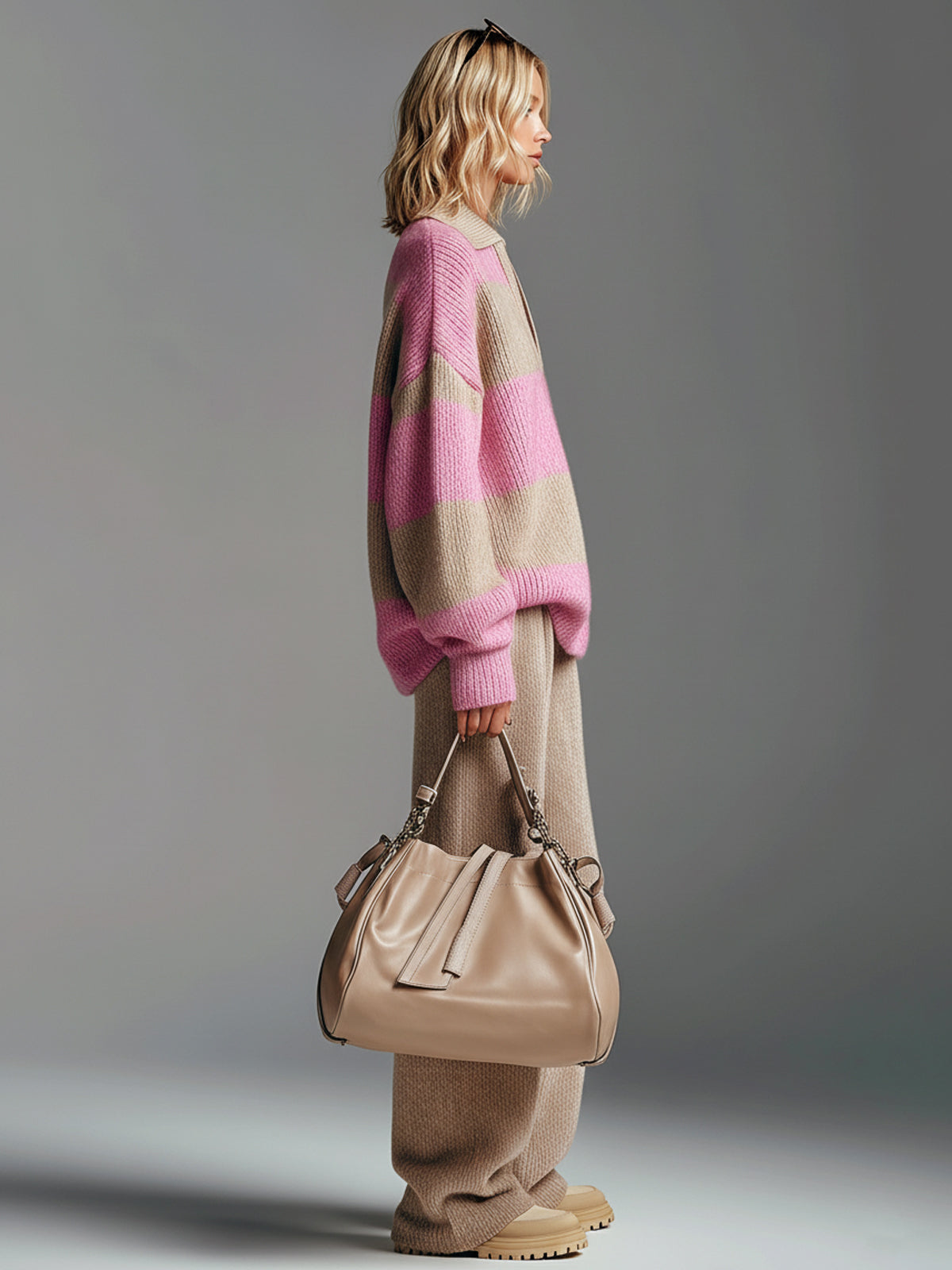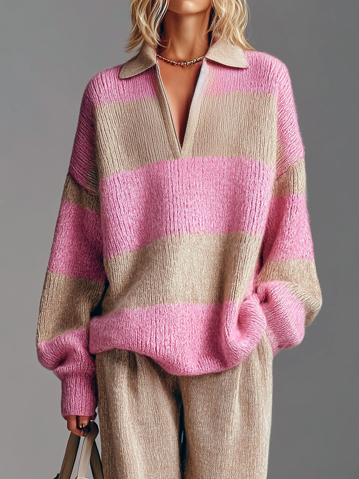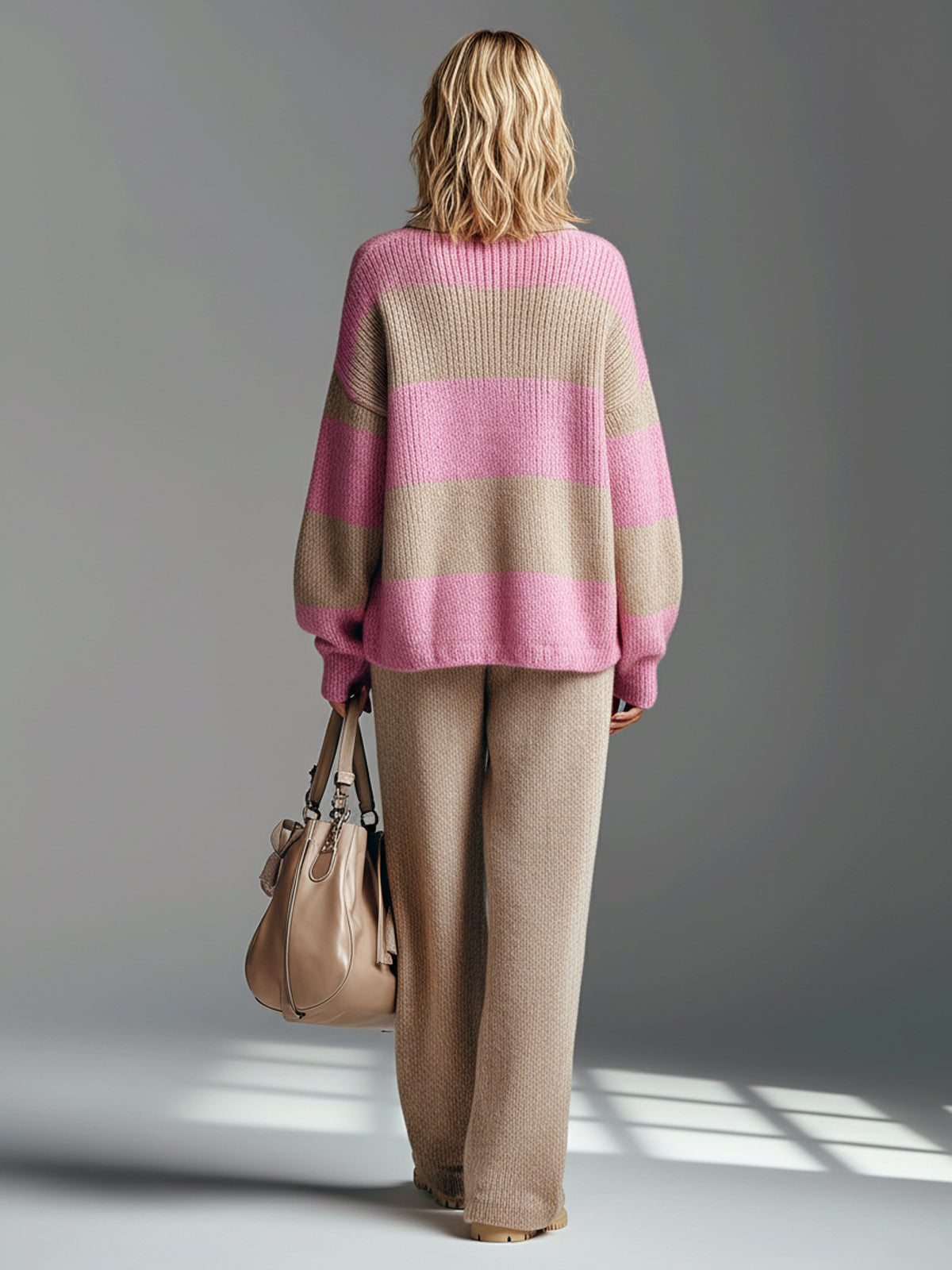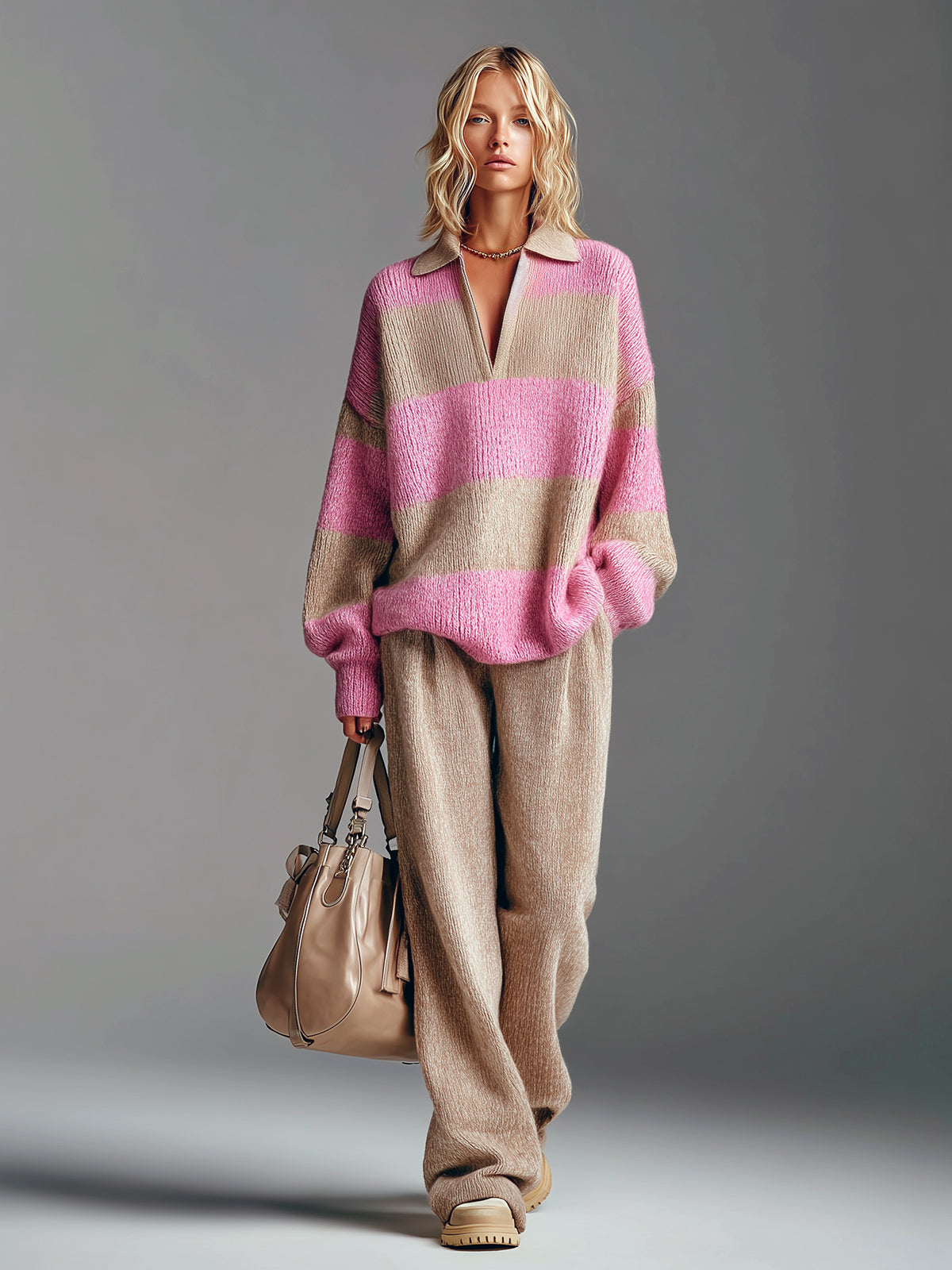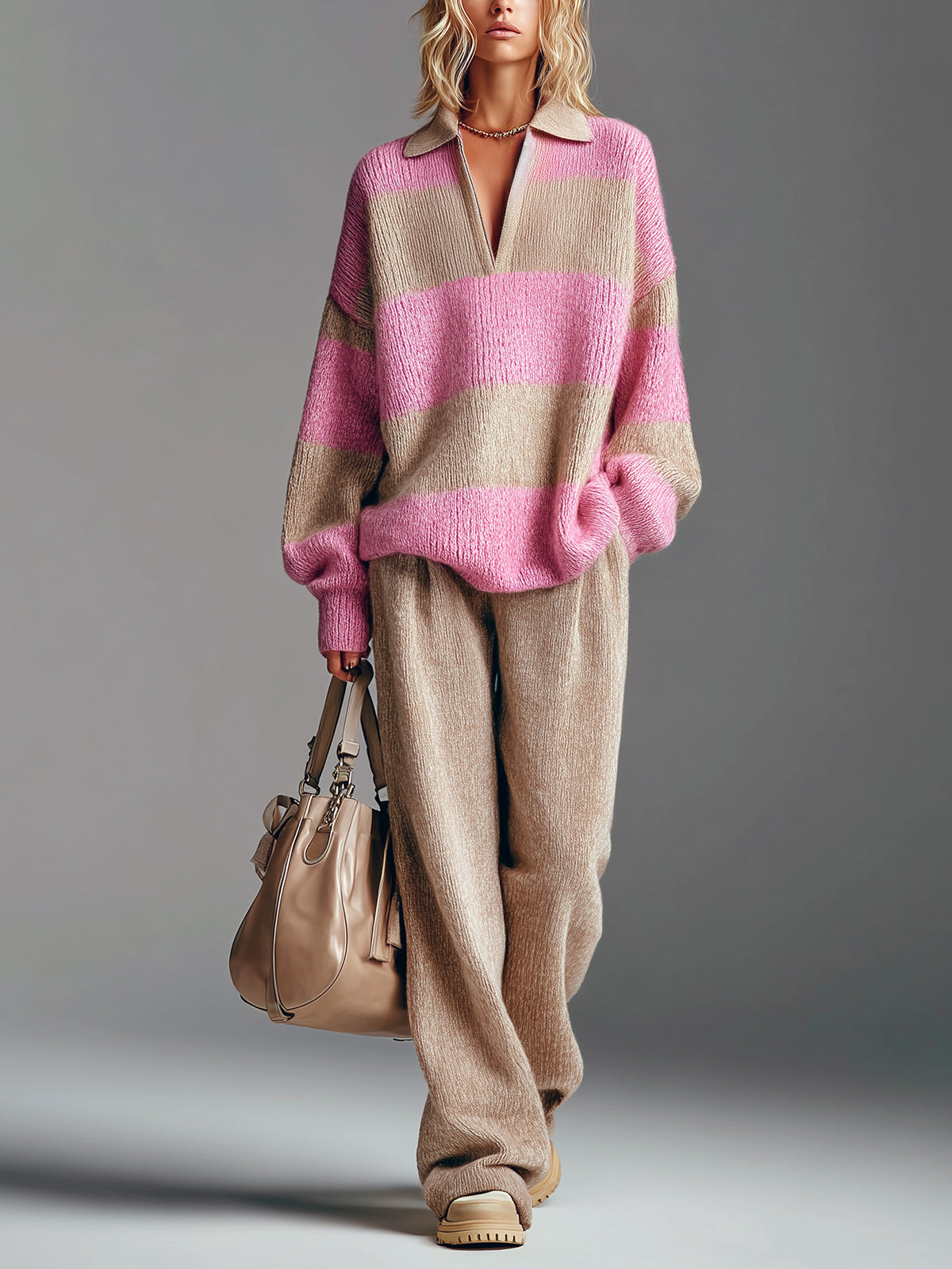 The Marcelline Two-Piece Set redefines cozy elegance with its refined design and relaxed silhouette. Featuring a chic lapel V-neck sweater with contrast stripes and flowing wide-leg pants, this set combines classic vintage inspiration with modern comfort. Whether at home, in the city, or on a casual outing, Marcelline offers a look that feels as luxurious as it appears.